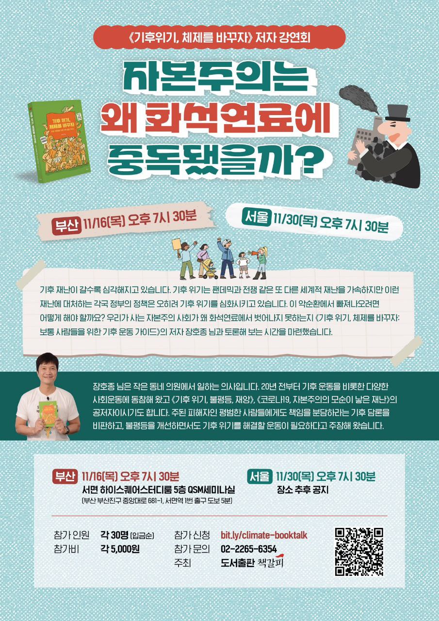 우리가 사는 자본주의 사회가 왜 화석연료에서 벗어나지 못하는지 《기후 위기, 체제를 바꾸자: 보통 사람들을 위한 기후 운동 가이드》의 저자 장호종 님과 토론해 보는 시간을 마련했습니다.